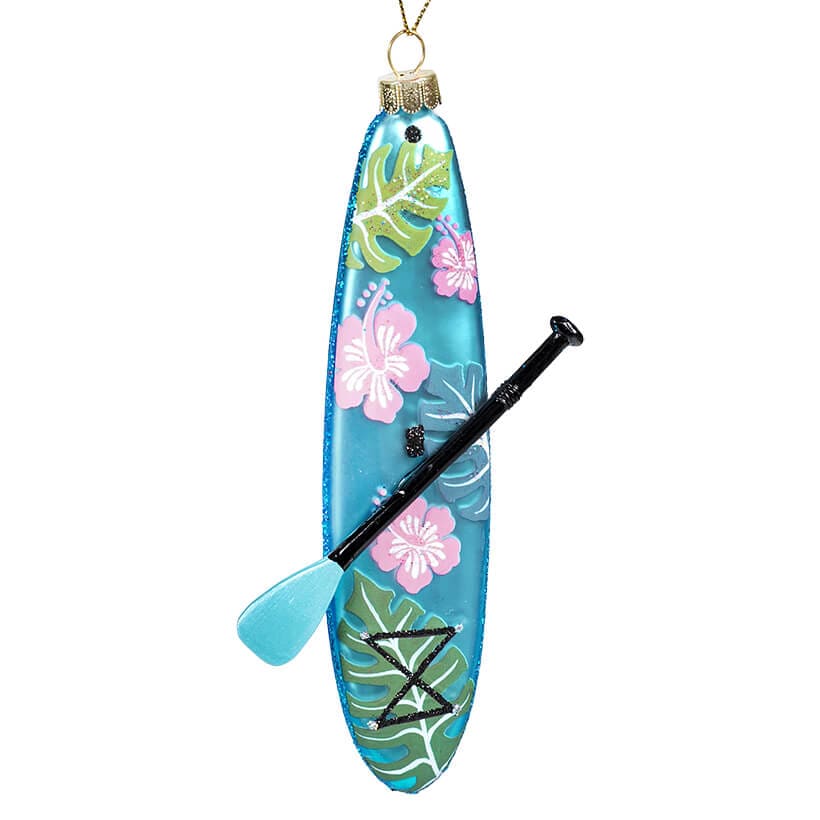 This ornament shines with a vibrant blue color and includes a paddle accessory. The surface is beautifully decorated with a tropical pattern of hibiscus flowers and palm fronds, set against a backdrop that evokes the clear, tranquil waters of a beach paradise. Sparkling glitter traces the contours of the flowers and the edges of the board, giving it a festive glimmer reminiscent of sunlight sparkling on the water.