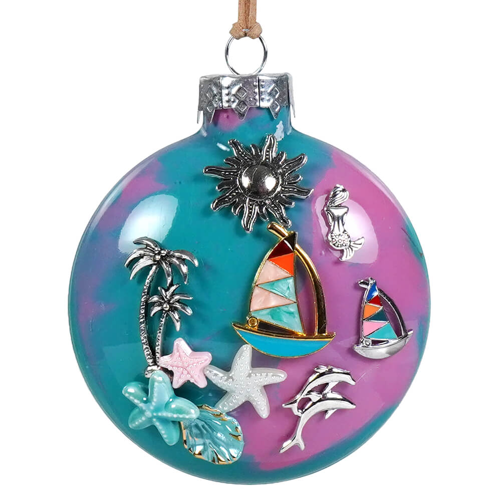 Set sail for holiday paradise with the Blue & Pink Tropical Ornament by Bette Fraser Day—a bauble so beachy, it practically comes with a mai tai. This vibrant ornament is bursting with tropical flair, featuring a dazzling array of metal charms: sailboats catching the breeze, starfish lounging like pros, dolphins mid-splash, palm trees swaying, the sun beaming, and even a mermaid who’s clearly ditched the North Pole for warmer waters.