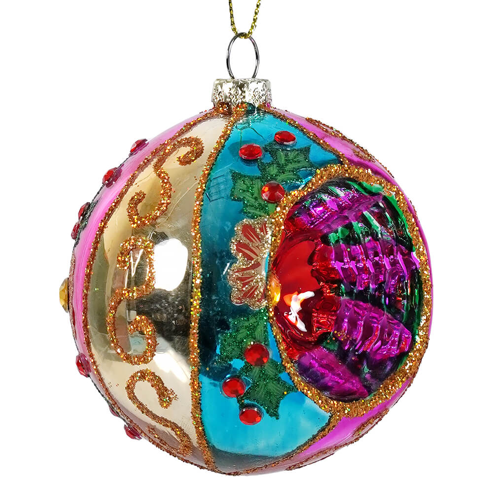 At its heart is a radiant pink floral indent that gleams like a jewel, surrounded by swirling holly and gold accents that glint beautifully under twinkling lights. The “witch eye” center catches reflections like a crystal ball, giving this piece a mystical allure while staying delightfully festive. Its textured surface and brilliant color palette create a sophisticated balance of charm and sparkle, making it a perfect conversation piece for your holiday tree.