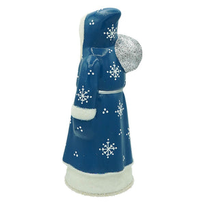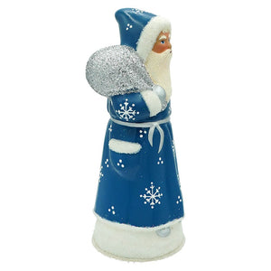 Handcrafted Ino Schaller paper mache Santa, made in Germany. The Ino Schaller company is one of the last remaining family owned companies that hand crafts traditional paper mache figures, all from materials sourced and located in Germany. These Ino Schaller pieces are the real deal, and it makes us proud to continue the tradition of collecting that they started over 100 years ago. Like the personification of winter, this Santa has hand painted snowflake detailing on his coat, which is a lovely shade of blue instead of his traditional red. Small clear beads give fun accents to his coat's lining as well as the snowy hill he stands upon. For that little bit of sparkle that makes Christmas so magical, glitter is found decorating his beard and sack of presents. With a sweet face and the kind of detail that only handmade things can bring, this Blue Santa is a lovely addition to a Santa themed figure collection or display!