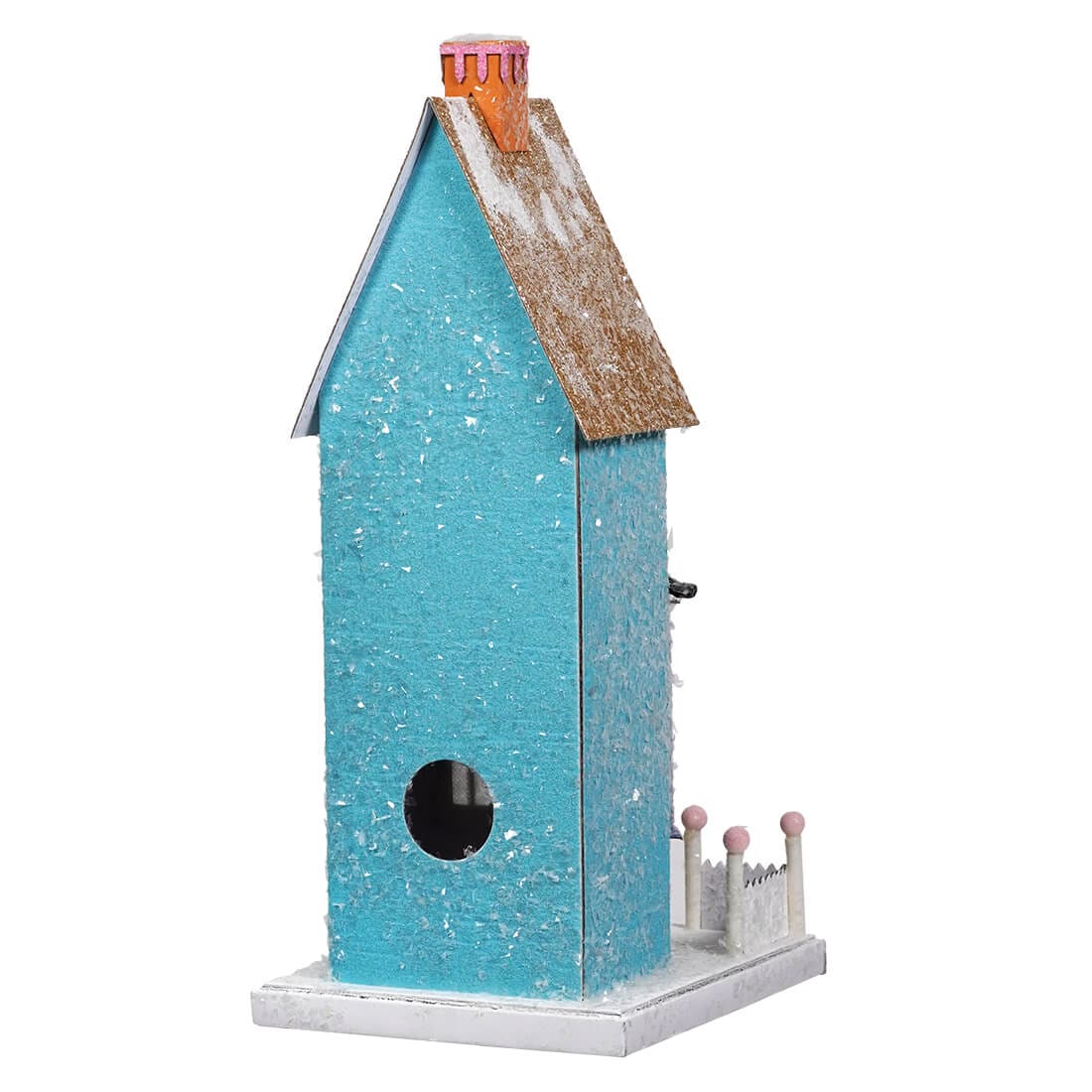 A Christmas wonderland village will benefit from the Blue Townhouse, a festive paper Christmas village house that stands a grand 11.75 inches tall. This charming abode is a frosted fantasy brought to life, with its ice-blue walls and sparkling snow-kissed roof inviting stories of holiday magic and joyful gatherings.