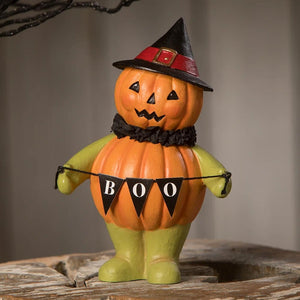 Make this Halloween a bewitchingly delightful one with the Boo Pumpkin Head Witch! This playful piece by Bethany Lowe is an absolute must have for your Halloween decor. A surefire way to add a bit of witchy fun to your collectibles display. This adorable little pumpkin holds a "BOO" garland between its hands that'll certainly give all of your guests a frightful scare - but in the best possible way. Her pointed hat and unique orange pumpkin design is absolutely eye-catching, you won't be able to take your eyes off of her! So bring some added charm this Halloween season and add the Boo Pumpkin Head Witch to your Halloween display!