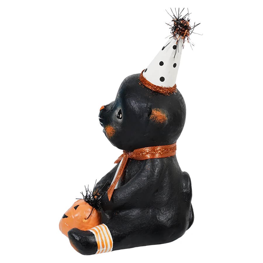 Such a sweet face, Boots Halloween Party Kitty is certainly not a scary figure for Halloween! You just want to hug this Michelle Allen design, we think it is a testament to how Michelle must be in real life. All of her figures are just so precious, there is nothing scary or mean about them and this little guy is no exception. We love to gather a few of her Halloween cats and ghosts together and surround them with candy corn colored bottle brush trees on a shelf or tabletop. Boots Halloween Party Kitty, in his white and black dotted party hat and holding a smiling pumpkin bucket, will make a terrific addition to any display in your home.