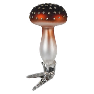 Its natural design is enhanced by the stem's smooth transition from frosted white to the gentle coppery brown of the cap's rich tones. The ornament's base metal clip makes it simple to attach it to garlands, wreaths, tree branches, or even seasonal table arrangements. The modest appeal and brilliant sparkling spots of this mushroom ornament make it a perfect addition to any forest-themed décor.