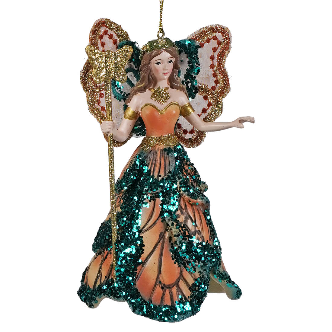 She looks like she walked straight out of a forest where fey run the court. The Brunette Fairy Queen Ornament stands 5 inches tall and carries the look of monarch wings stitched into a gown, with bold sequins, layered texture, and a steady gold staff in hand.