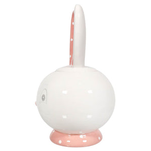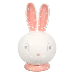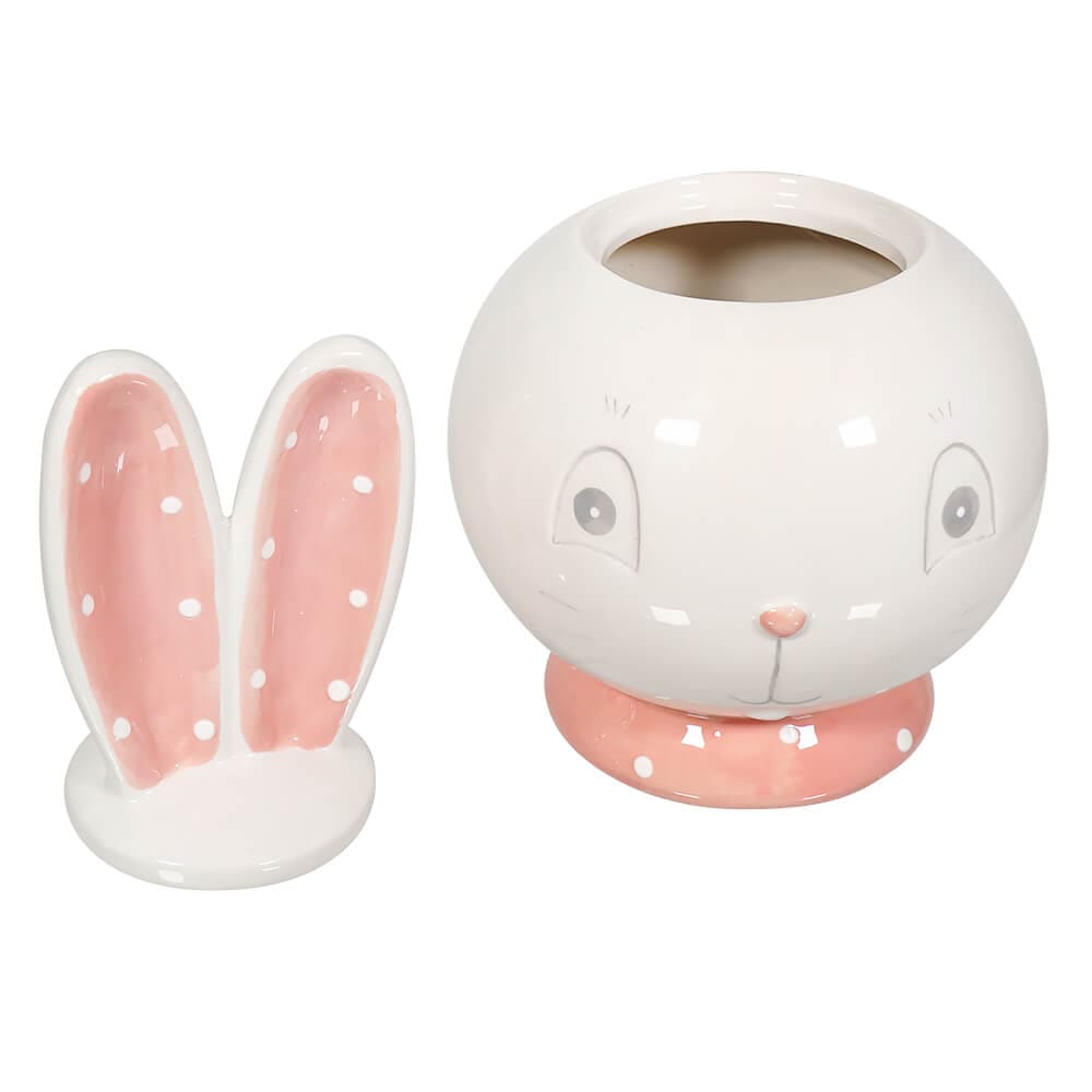 Johanna Parker's design expertise shines through in this fabulous Bunny Ears Cookie Jar. The jar features a cute round face with a sweet little smile under its pink nose, guaranteed to make you smile whenever you see it. White polka dots adorn the pastel pink interior of the bunny's ears, as well as the pink base, adding a playful and festive touch reminiscent of a decorated Easter egg.