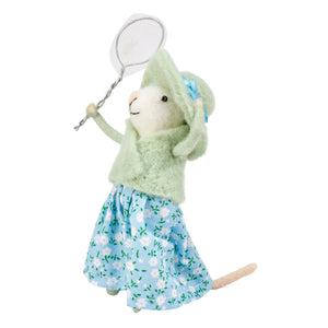 The Butterfly Net Mouse Critter by Primitives by Kathy is springtime charm captured in soft fabric and felt. This little white-furred mouse is dressed in a pastel ensemble that perfectly evokes gardens, sunshine, and Easter celebrations. She wears a delicate blue floral skirt with a green sweater and matching hat, all crafted from soft, tactile materials that add warmth and personality to her pose. Every detail, from the folds of her skirt to the texture of her felted sweater, gives her a handcrafted, approachable quality that makes her a standout on any tabletop display.