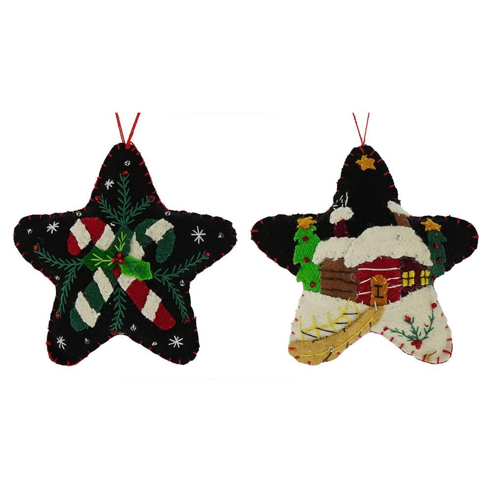 We are consistently amazed at the skill with which these wool felt ornaments are crafted. Each ornament is created using appliqued felt pieces and cross stitching with little beads added for embellishment. The Canes & Winter Home Stars ornament set includes crossed candy canes and a winter home in the snowy woods on black felt stars. They are light weight, so charming, and they look amazing on nearly any tree, especially feather trees with large spacing between the branches.