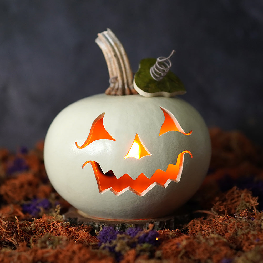 With a grinning face carved into his creamy white gourd body, Cannon is the perfect blend of eerie and elegant. He glows like a moonlit whisper from your porch or mantel, casting just enough light to let the trick-or-treaters know you’ve got the good candy. Think of him as Halloween’s answer to minimalist décor—if minimalism had a slightly haunted sense of humor.
