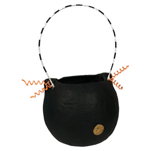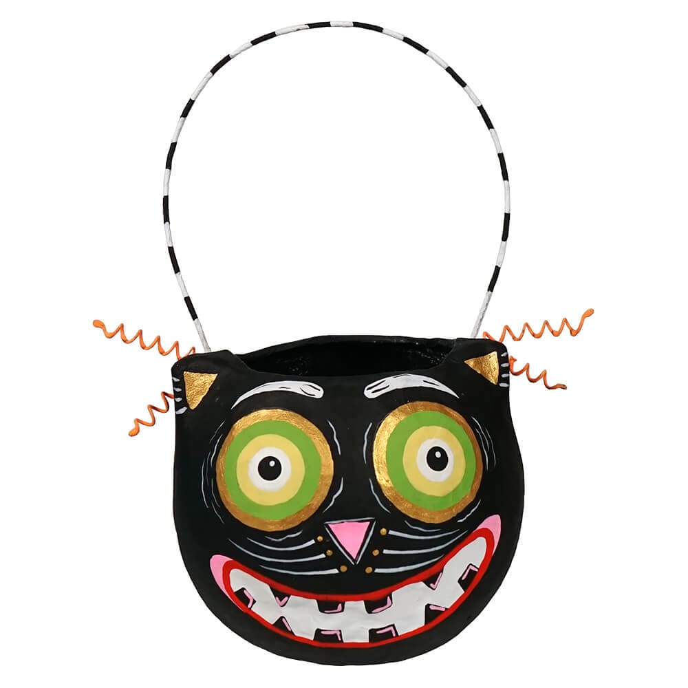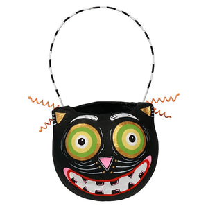 It's almost the Halloween season, so of course the black Cat Face Halloween Mini Bucket is just so darned excited! It's his time of year, where all black cats come out to spook and meow, maybe even scare those little trick or treaters. He wants to be placed in a position of prominence in your home, so make sure you hang him front and center on your Halloween tree or in the middle of your mantel garland The mini black cat face bucket is made of paper-mache and hand painted with all of the details you've come to expect from the Glitterville artisans. It's wire handle will allow you to hang it, but you could also use this contemporary Cat Face Halloween mini Bucket to carry sweet treats for snacking when you attend a party!