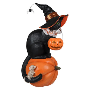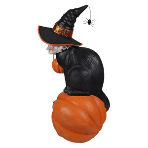 The Cat Witch on Pumpkin by Bethany Lowe will prove that Halloween mischief is a full-time job! Dressed to impress (and possibly hex), this cunning kitty sports a classic witch hat with a dangling spider for extra spook factor. A crisp white neck ruff adds a touch of elegance — because even feline sorcerers know that style matters.