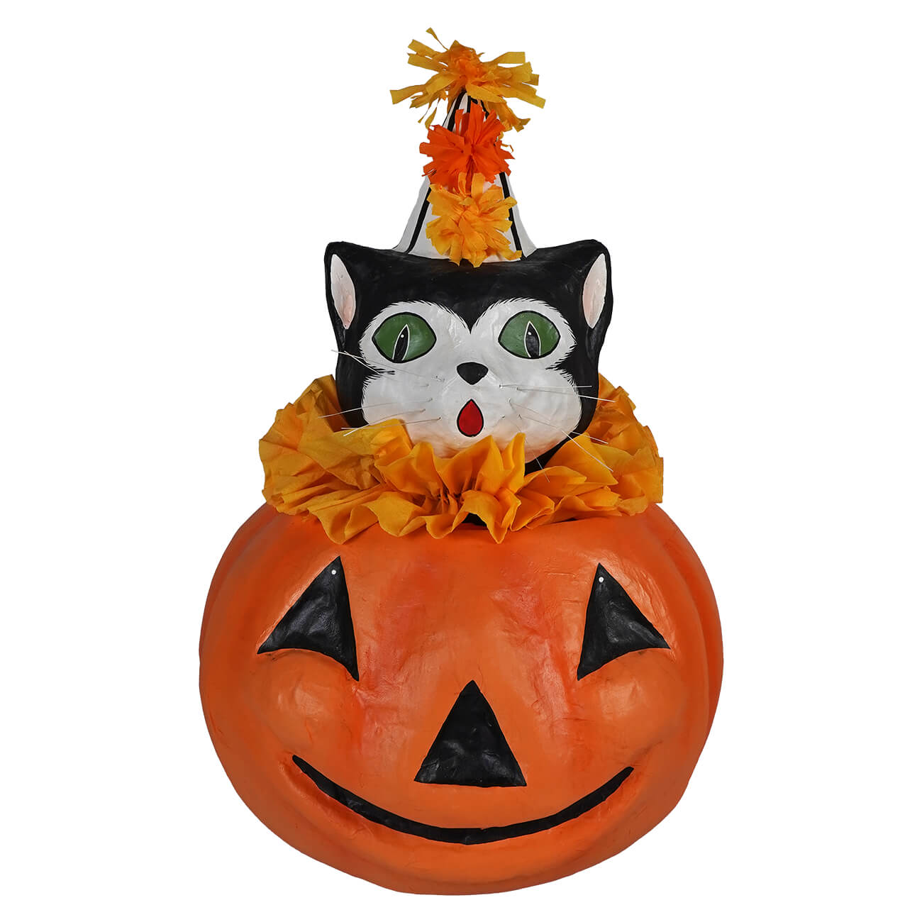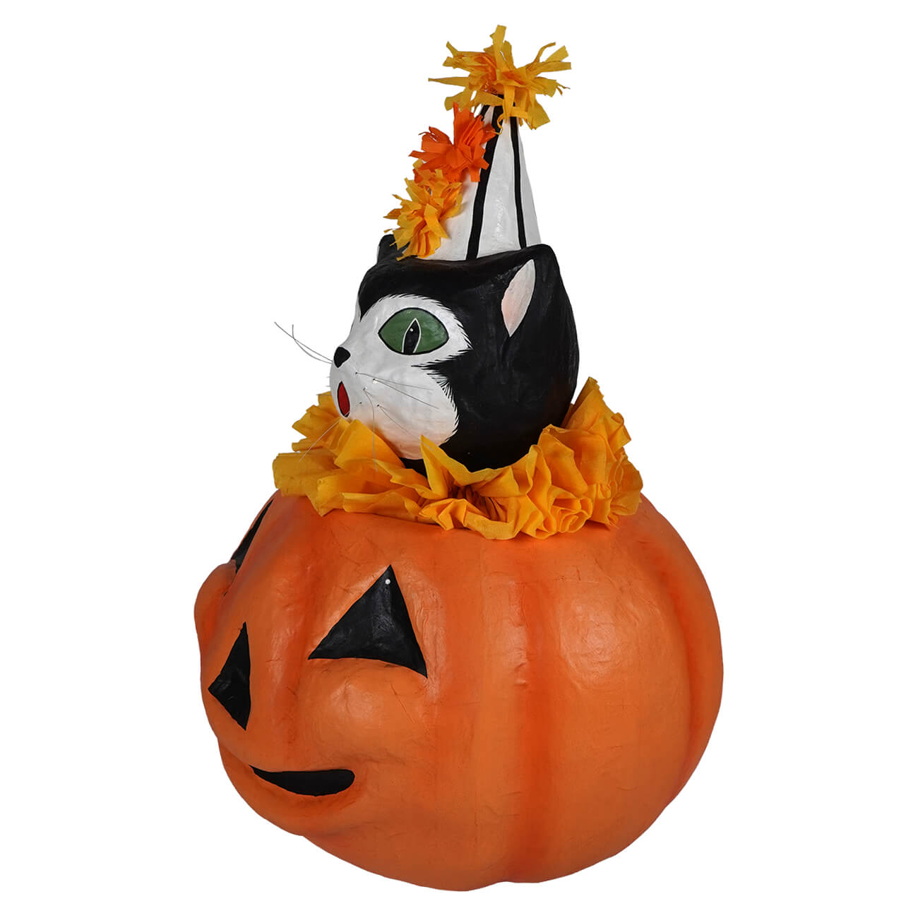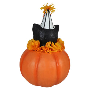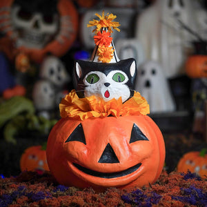 With his curious expression and dapper fur coat, Cecil brings a dash of feline charm to your Halloween décor. The classic jack-o'-lantern beneath him glows with a timeless grin, adding just the right touch of festive fun.