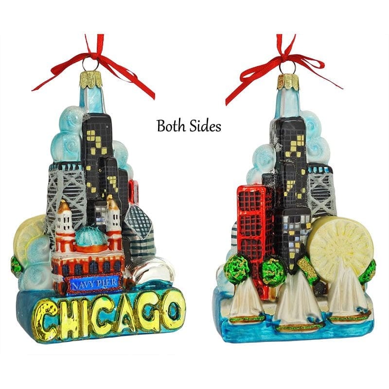 A Chicago cityscape ornament complete with the Navy Pier and Downtown skyline. Chicago's skyline is one of the world's tallest and easily ranks among its most magnificent. It boasts four of America's eight tallest buildings and, if you include its antenna, the massive Sears (Willis) Tower remains the fifth tallest skyscraper in the world. The Chicago cityscape glass ornament comes boxed, perfect for gift giving!