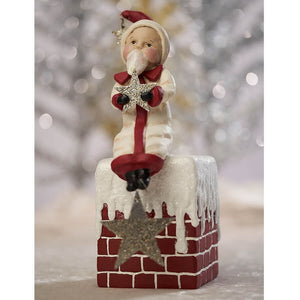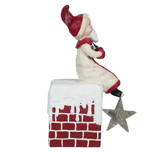 As he sits with his legs dangling over the edge of the chimney, a large silver glittered star hangs playfully from his feet. It adds a touch of whimsy to his relaxed pose, capturing the joy and happiness he brings to children all over the globe.