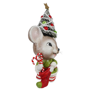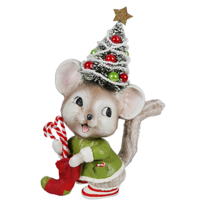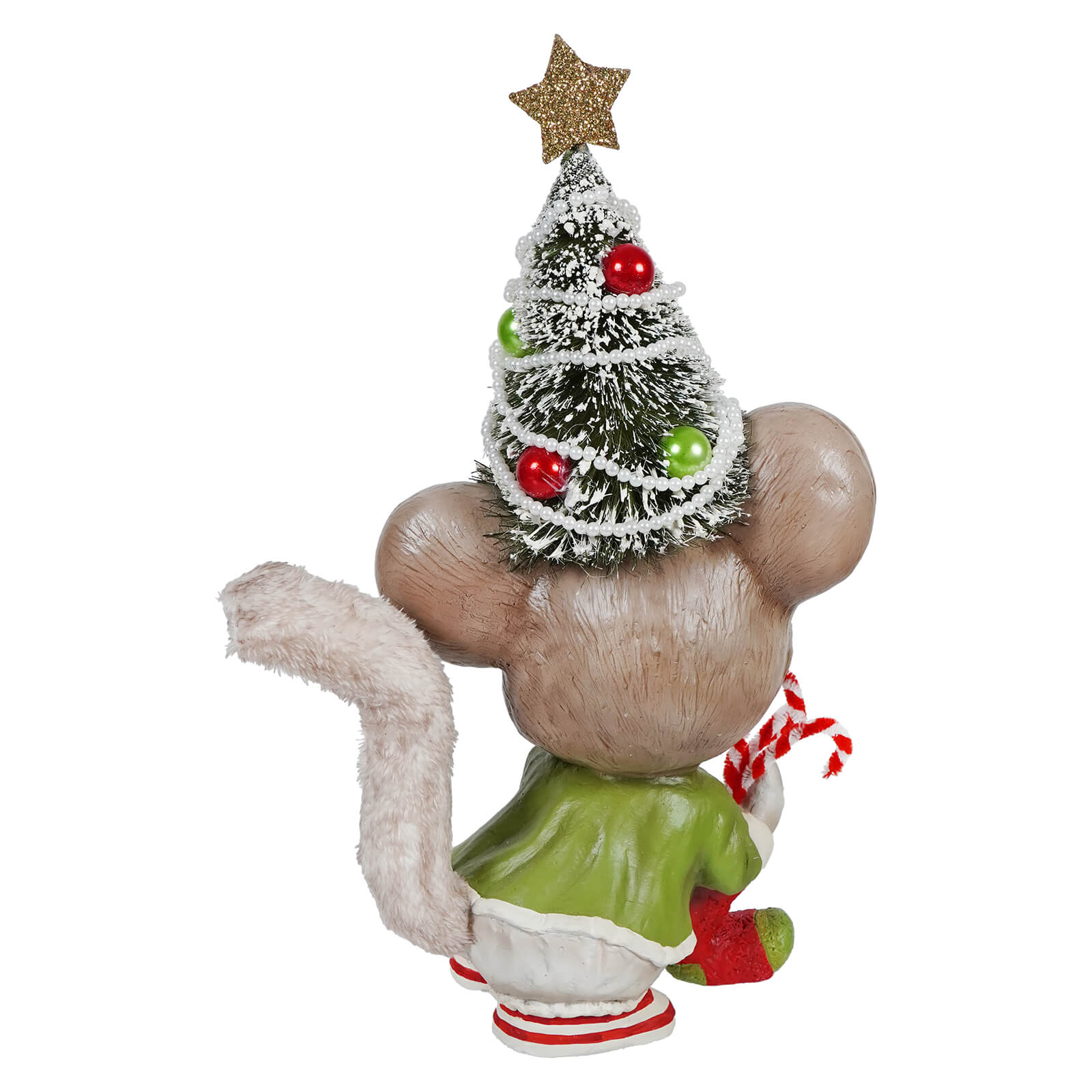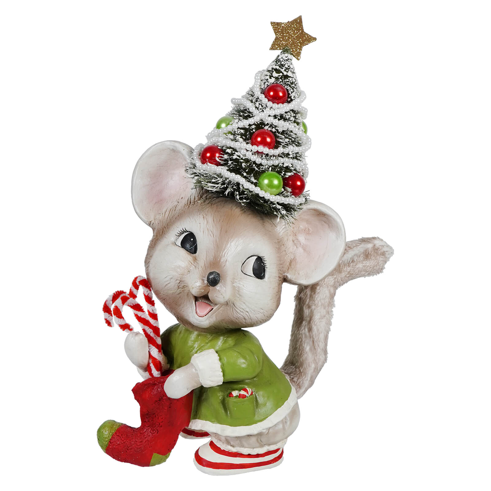 A new character from the Bethany Lowe artisans. Dressed in holiday spirit from head to toe—literally—the Christmas Tree Memzi Mouse brings a cheerful, whimsical presence to any Christmas display. This 14.75-inch hand-painted resin figure features Memzi wearing a festive green coat and balancing a decorated Christmas tree on her head. The tiny tree, adorned with colorful ornaments and a gold star topper, pairs perfectly with her candy-striped stockings and the two candy canes she holds with delight.
