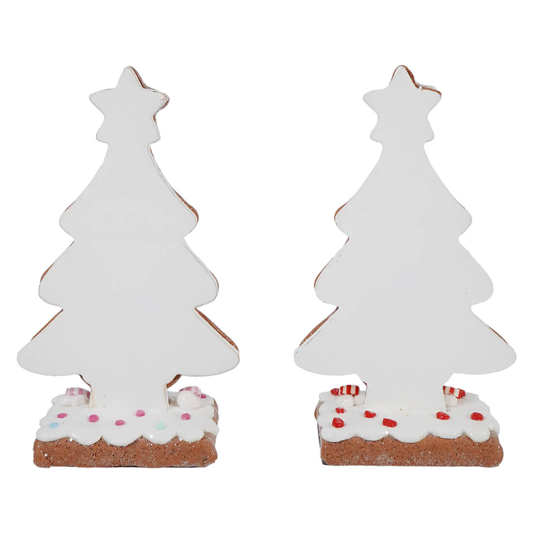 Each of the trees has a distinct design. A deep green design accentuated with striking red and white candies is shown on one tree, while the other has a frosty green base adorned with pastel candy accents such as peppermint swirls, candy canes, and gumdrops. The branches of both are covered in snowy "icing," and for a last festive touch, a gingerbread star is placed on top. Their bases have the confectionery charm of traditional gingerbread cookies with piped icing accents.