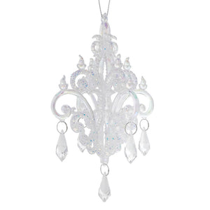 Elevate your holiday décor to sparkling new heights with the Clear & Iridescent Chandelier Ornament by Kurt Adler. With a dazzling silhouette that tapers to a point like a glimmering icicle, this ornament brings a refined sense of drama to your tree. It features petite candle-like details on each arm—short, sweet, and styled to perfection—giving it the look of a miniature crystal chandelier that’s ready for its grand entrance.