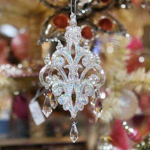 The entire piece is bathed in an iridescent finish that shimmers with every flicker of light, casting rainbow reflections that would make a snowflake jealous. Dangling crystal-like accents add extra movement and shine, catching the eye and stealing the spotlight with every twinkle. It's the kind of ornament that turns casual glances into double takes and makes your evergreen look like it shops exclusively at high-end boutiques.