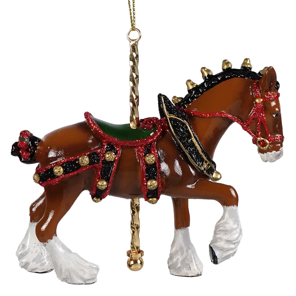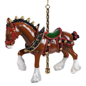 With its powerful build and iconic feathered legs, this 4.5-inch resin Clydesdale carousel ornament brings a touch of classic fairground grandeur to any holiday display. This proud figure stands in mid-stride, one massive hoof lifted as if marching to the steady beat of a parade band.