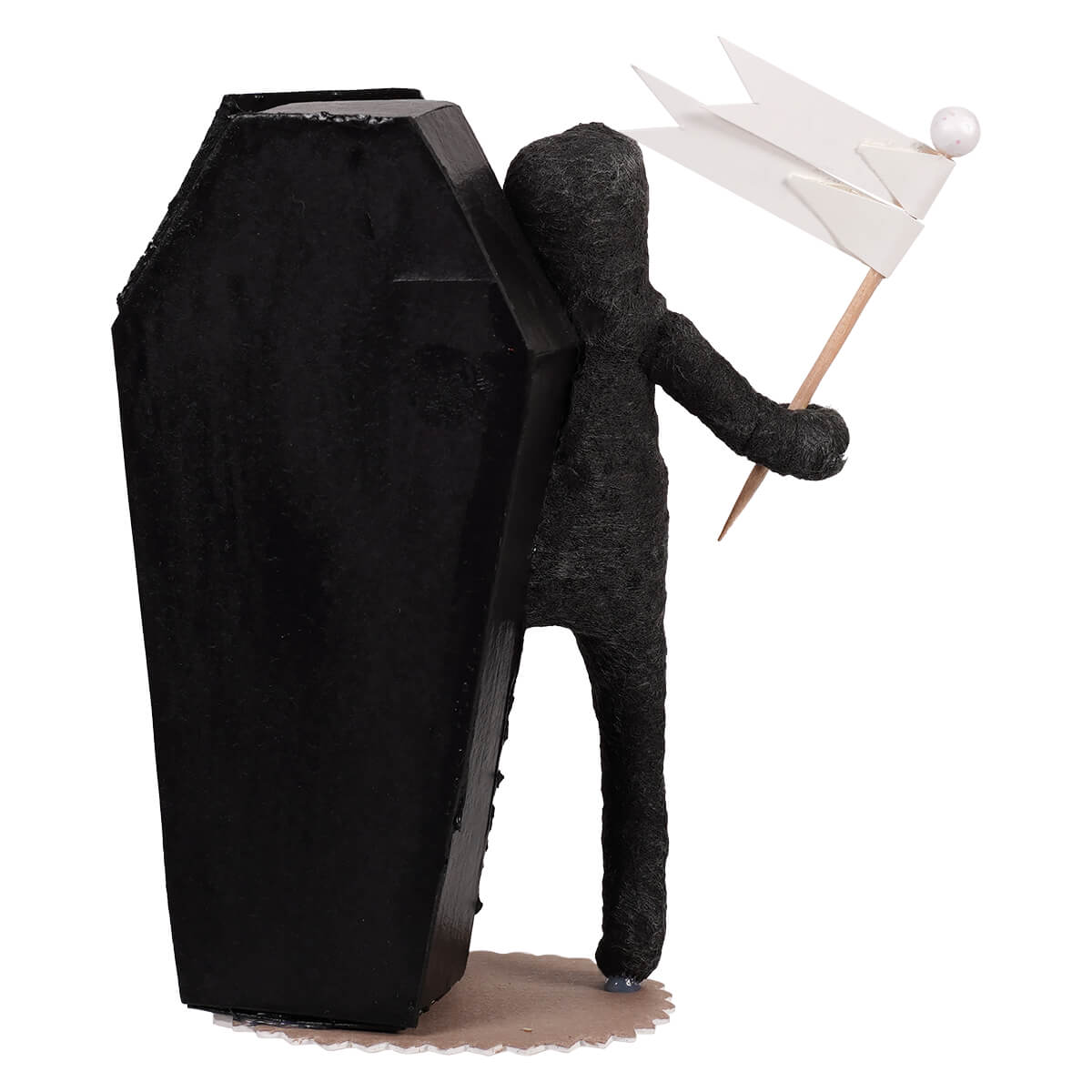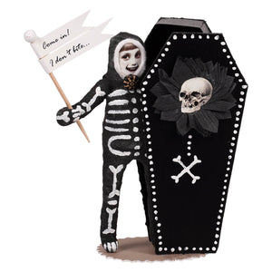 Coffin Skeleton Boy by Vintage by Crystal is ready to welcome visitors from beyond the grave with a playful grin. Crafted from spun cotton, this little skeleton peeks out of his coffin like he’s been waiting all year for company. His hand-painted details give him a delightfully eerie charm that balances spooky with sweet.