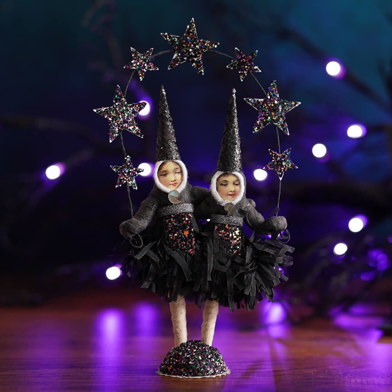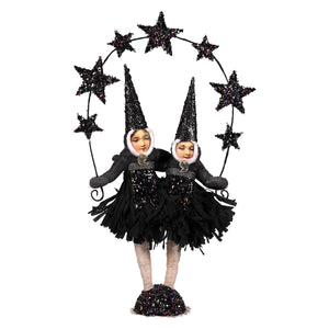 Above their heads, sparkling black stars shimmer like a night sky, adding an enchanting, celestial flair to their spooky style. Every detail—from the flowing folds of their conjoined dress to the glittering accents—shows off vintage-inspired craftsmanship with a playful twist.