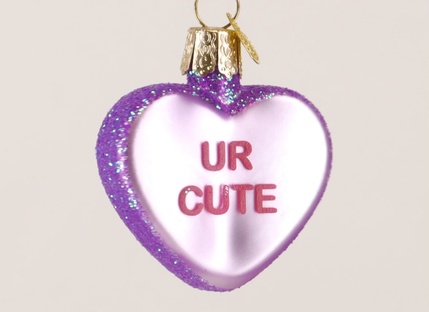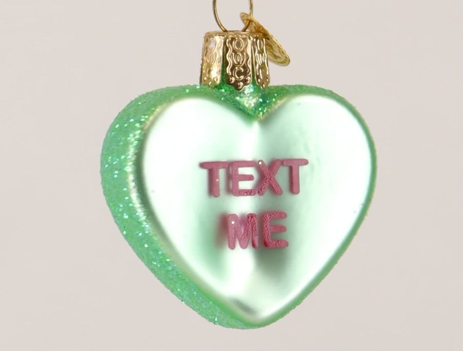 Inside the box, you’ll find three love-struck hearts: a flirty pink one that says “crazy 4 u,” a minty green heart that demands “text me,” and a classic purple charmer whispering “ur cute.” Whether you're crushing hard or just crushing candy, these ornaments say it all—loud, proud, and in glitter.
