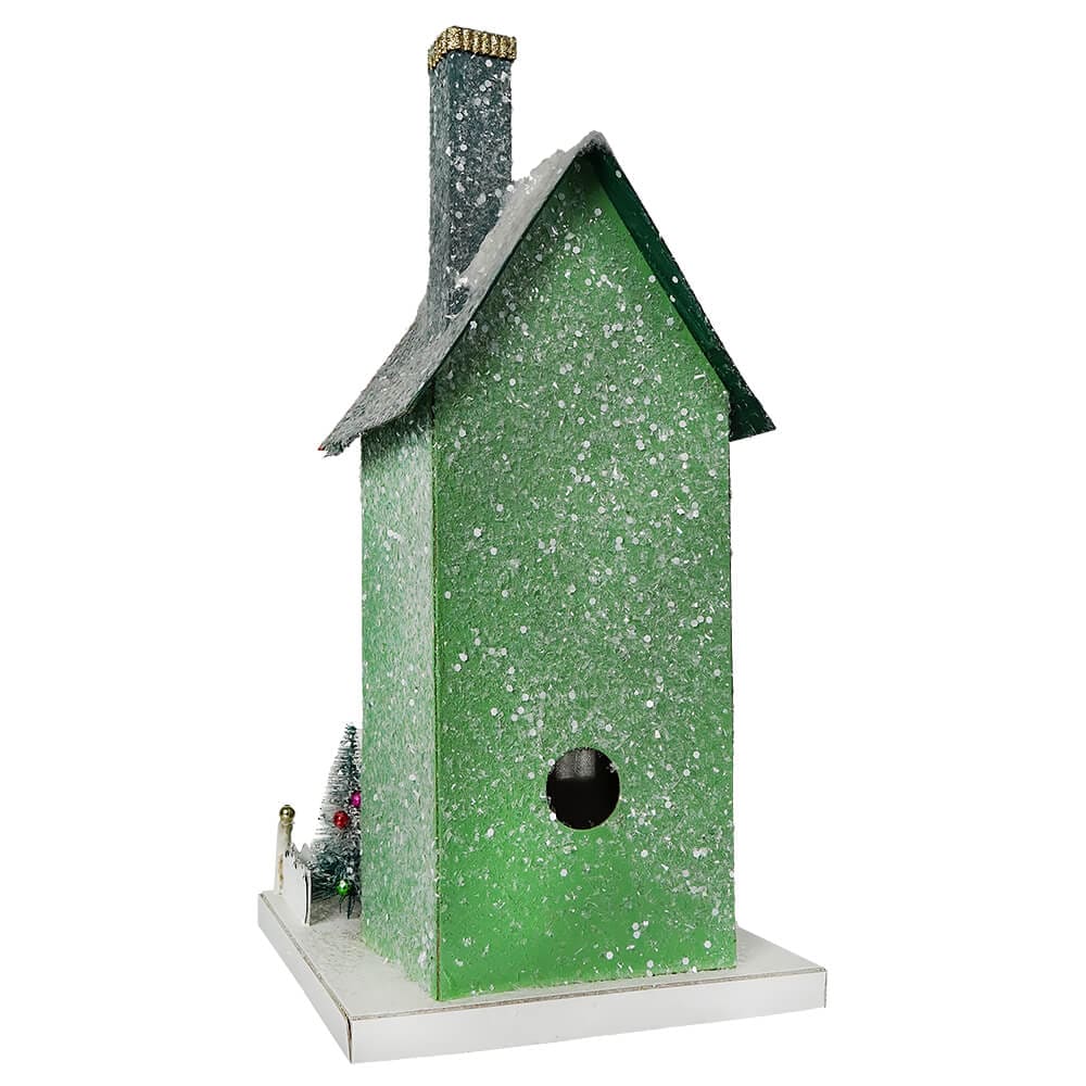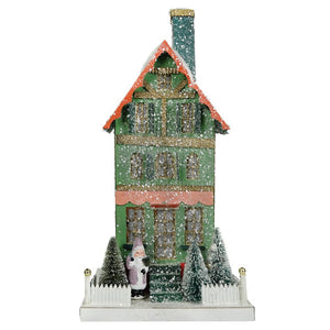 The Cozy City Home House, a delightful addition to your holiday decor! Crafted by Cody Foster, this piece measures 15.5x7.5x6.75 inches and is made from high-quality materials including paper pulp, bottle brush, glitter, and mica.