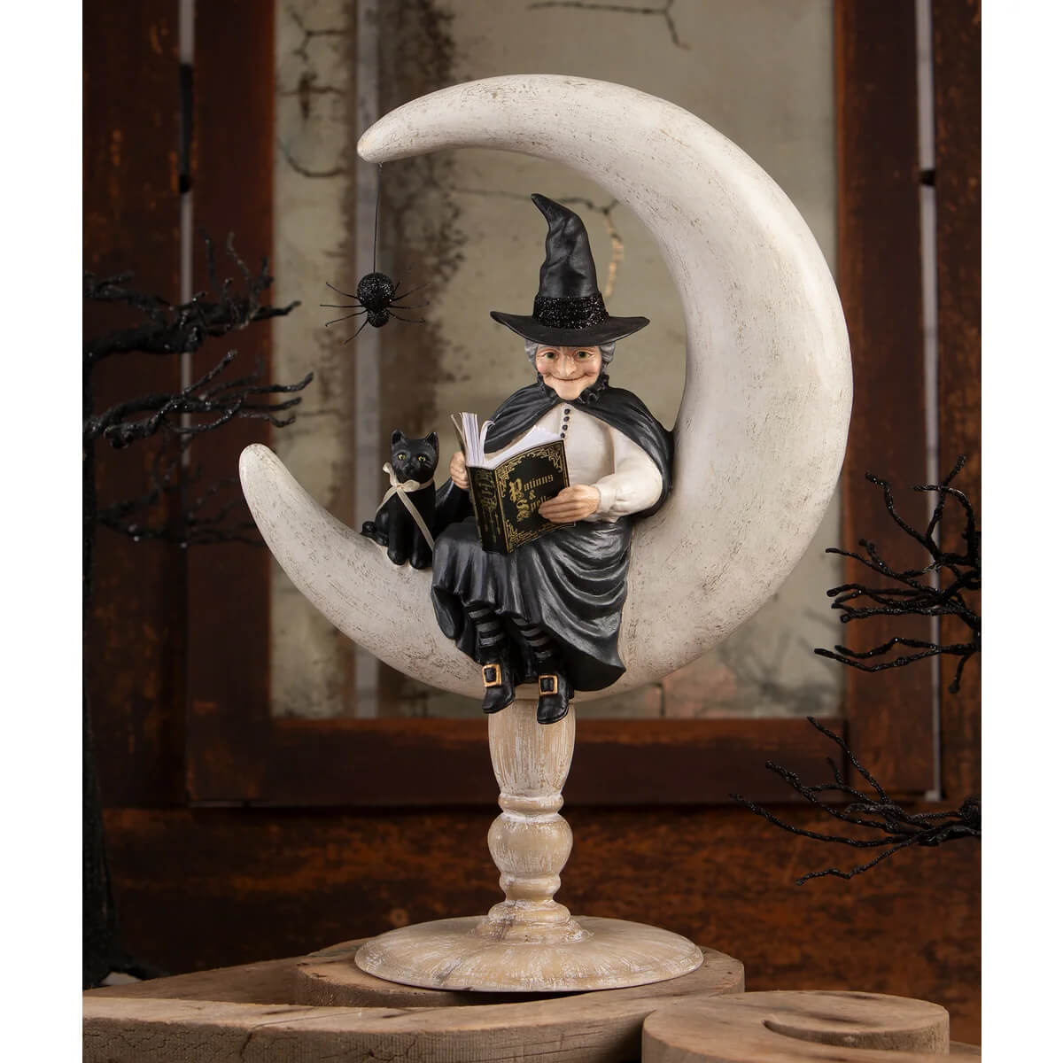 Set the scene for a magical night with Crescent Moon Moira Witch by Bethany Lowe Designs. This enchanting decoration features a soft white crescent moon, cradling Moira as she dives into the pages of her book. With a calm expression and her trusted black cat curled up beside her, it's clear this witch prefers cozy spells over chaotic cauldrons.