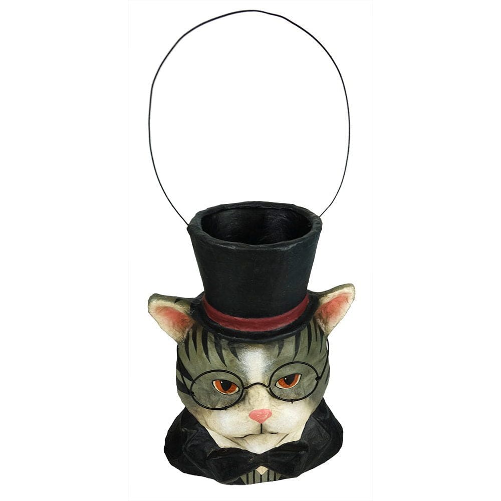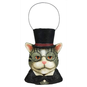 Dressed to the nines and ready to mingle, the Curious Cat Dandy Candy Bucket by Cody Foster is the feline embodiment of Halloween elegance. With his tailored black suit, polished bowtie, round spectacles, and a top hat that doubles as the bucket’s handle anchor, this grey gentleman isn’t prowling for mice—he’s here for sweets and style points. His orange eyes sparkle with curiosity (and maybe a little judgment), making him the most refined candy carrier on the block.