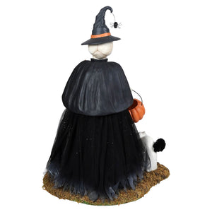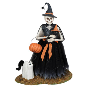 Meet Deadra Skeleton, the bone-afide queen of Halloween chic. Dressed in her sleek black dress and signature witch hat — complete with a dangling spider accessory — Deadra knows how to turn heads at every haunted gathering. Her skeletal charm is undeniable, but it's her feline sidekick that truly steals the show. They both await the arrival of Henry Deadison Skeleton, he too travels with his feline companion!