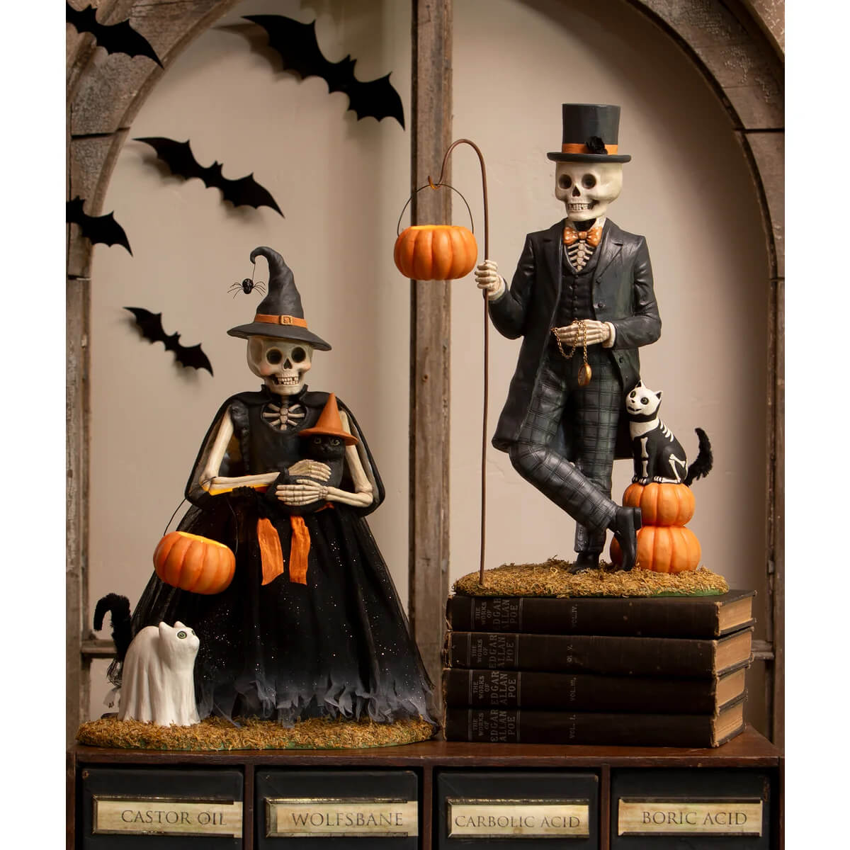From mantel displays to tabletop centerpieces, Deadra Skeleton brings a dash of magic and a sprinkle of spook wherever she goes. With her eerie elegance and her cat’s undeniable cuteness, this pair will have your Halloween décor looking absolutely bewitching.