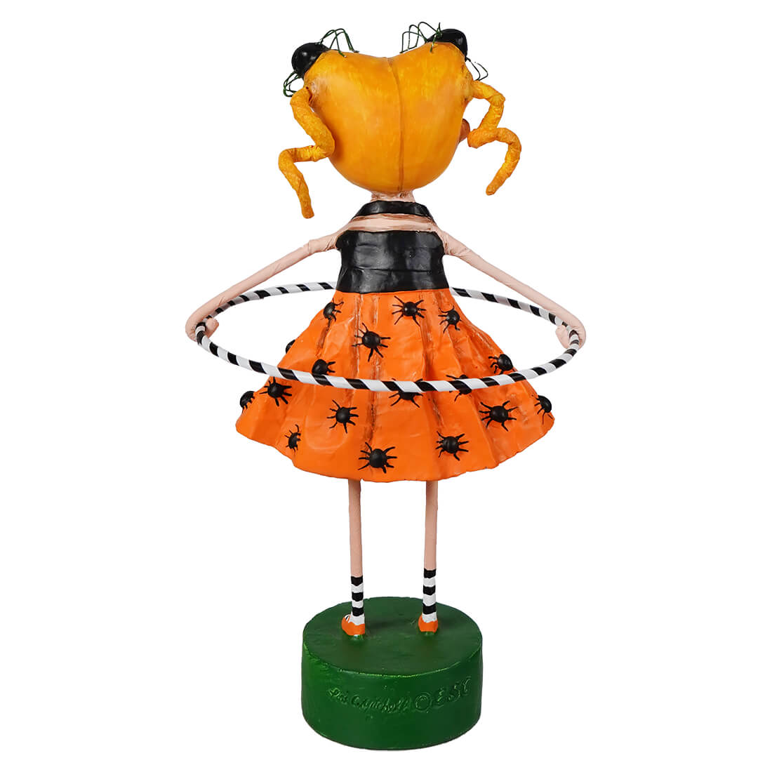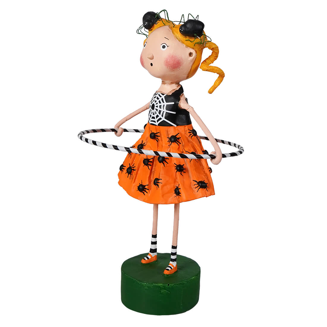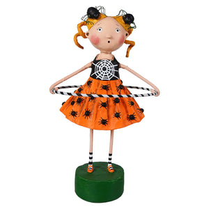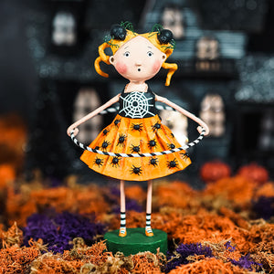 To top it all off, Dolly is proudly twirling a black and white striped hula hoop, because if you’re going to be surrounded by spiders, you might as well add a little fun to the mix! The combination of her spirited personality and spooky attire makes her the perfect addition to your Halloween collection.