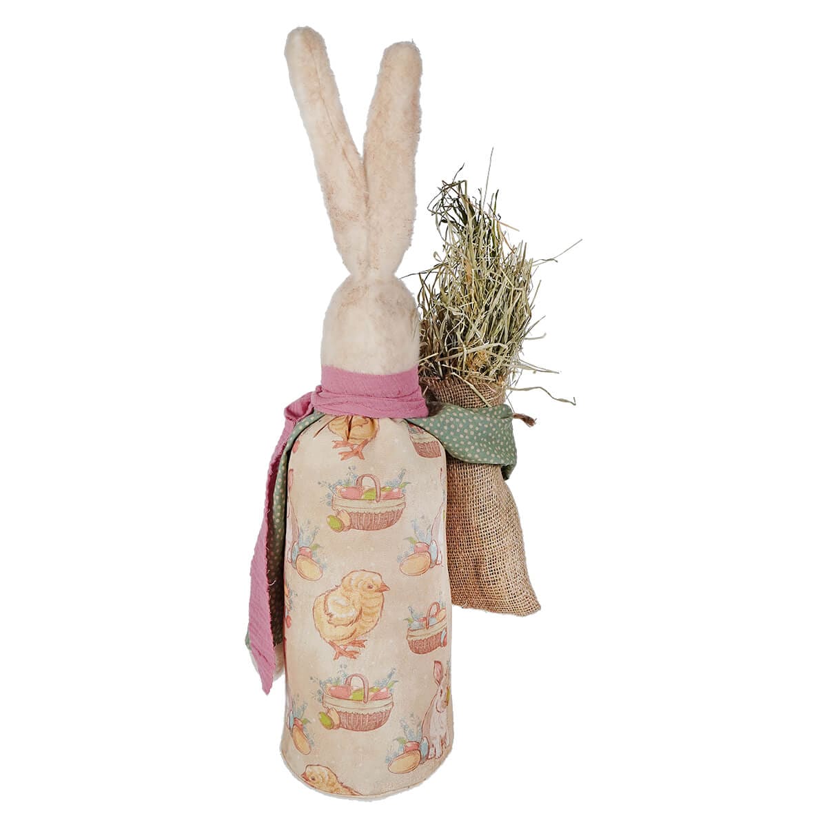Dressed to impress in a delightful dress adorned with pictures of yellow chicks, white Easter bunnies, and baskets brimming with colorful eggs, our bunny is the epitome of seasonal chic. And let's not forget her pièce de résistance – a long pink scarf wrapped snugly around her neck, adding a touch of flair to her ensemble.