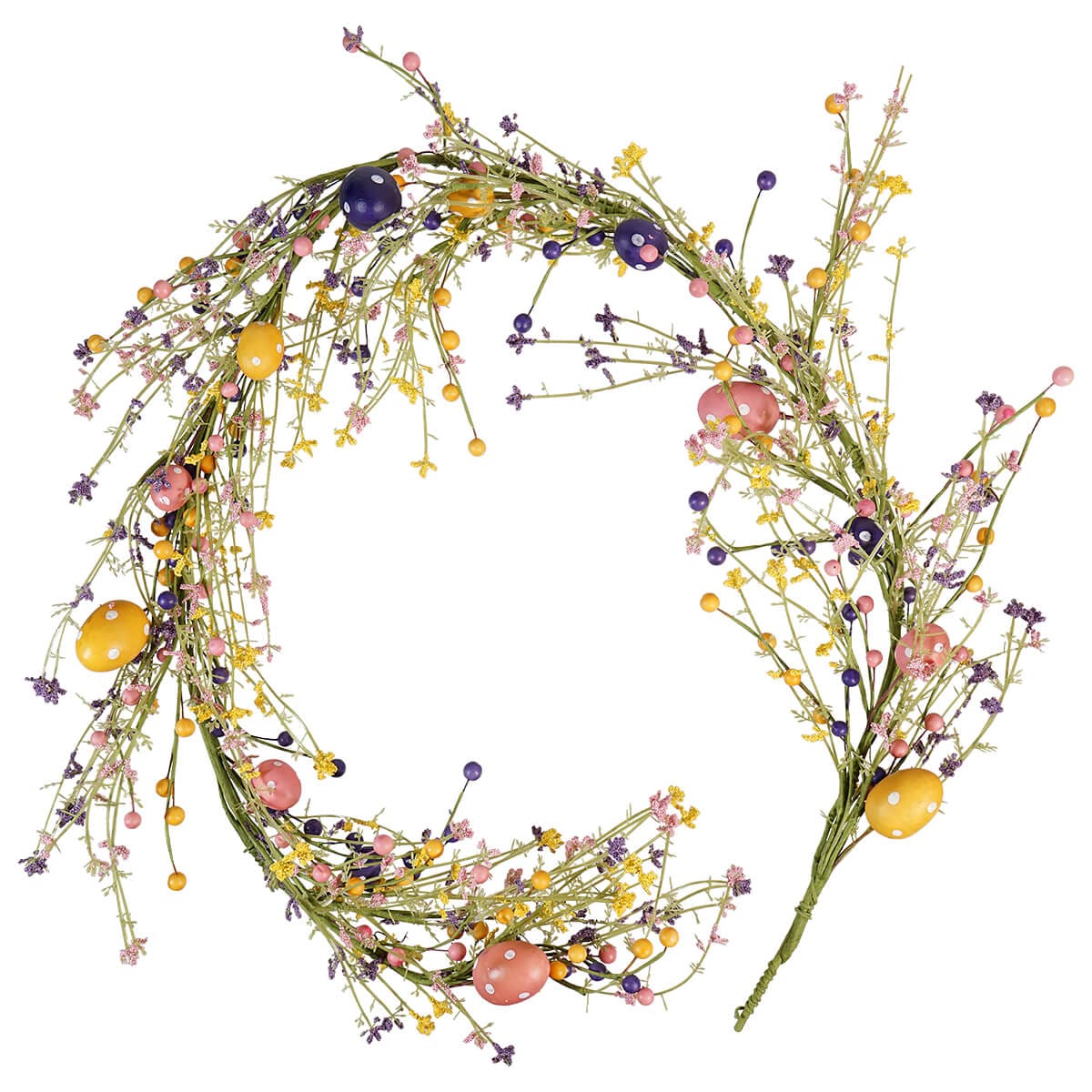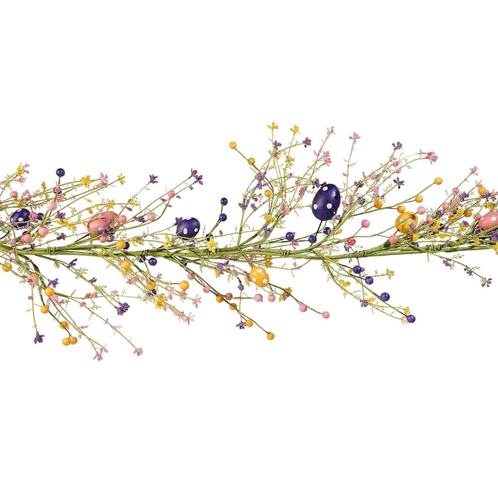 Crafted from a magical mix of plastic, wire, and styrofoam, this garland is not just decoration; it's a masterpiece of hop-tastic proportions. Picture berries, flowers, and eggs in a vibrant trio of yellow, purple, and pink, each element bringing its own pop of springtime cheer to the party.