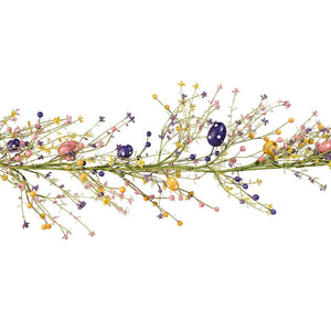 Such a pretty garland! The Easter Egg Garland can take you from Easter through all of Spring. The wired garland which is filled with pink, purple and yellow eggs with white dots as well as many tiny spring flowers looks so great trailed down your Easter table surrounded by larger eggs, bunnies and chicks. But it also looks springy over a mantel or doorway. Since it is wired, you have lots of options!