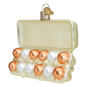 Why be forced to choose between brown eggs and white eggs when you can have both? The only difference between them is what color the chicken that laid them was anyway! A pack of twelve brown and white eggs are nestled in this Egg Carton ornament. Lines of glitter outlining the top and bottom of the carton make these eggs look fancy farm fresh. A truly versatile food for any time of day, this glass ornament is just as versatile for the holidays or all year round! Just be careful not to break them, or you might be stuck making the world's smallest omelet!