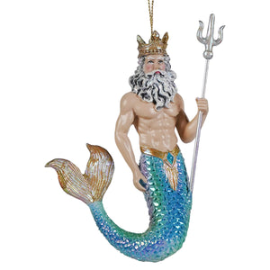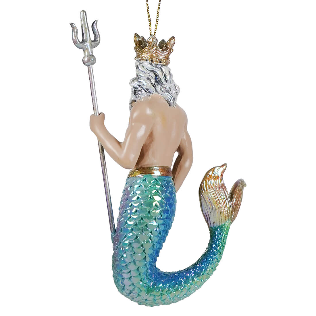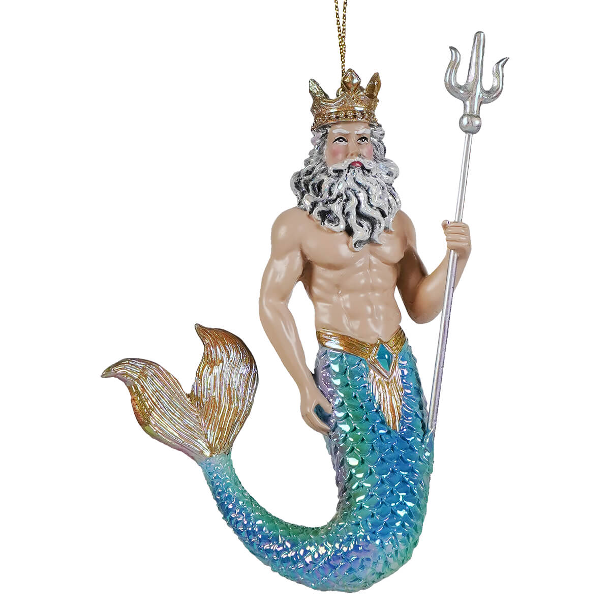 Cast in resin, this ornament features a muscular torso, flowing beard, and flowing white hair tucked beneath an opulent gold crown. His face is serious, with hand-painted details that bring out the shape of the eyes, brows, and beard. A silver trident rests in left right hand, angled upright and balanced with the confident posture of a ruler who knows exactly where he stands, or floats.