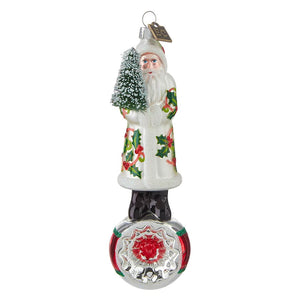 Eric Cortina is an ornament designer that melds both contemporary and vintage styles. So, meet our Elegant Holly Santa Ornament by RAZ Imports – where holiday charm meets chic sophistication. This isn't your average Santa; he's a trendsetting icon, redefining festive fashion with every holly-laden step.
