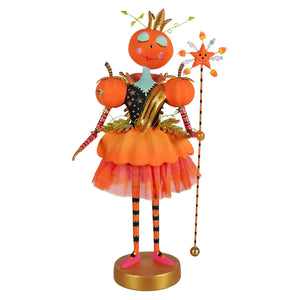 With her shimmering teal eyelids and matching neck (because even fairies know the importance of a pop of color), she’s serving up style and spells. Perched proudly atop her pedestal, she clutches a sparkly staff topped with a jack-o-lantern-faced star, complete with dangling taffy and candy corn—because what’s a Fairy Gourdmother without snacks and sparkle? Her glittering gold crown says she's the queen of Halloween, but her candy-topped scepter says she’s also here for the treats.
