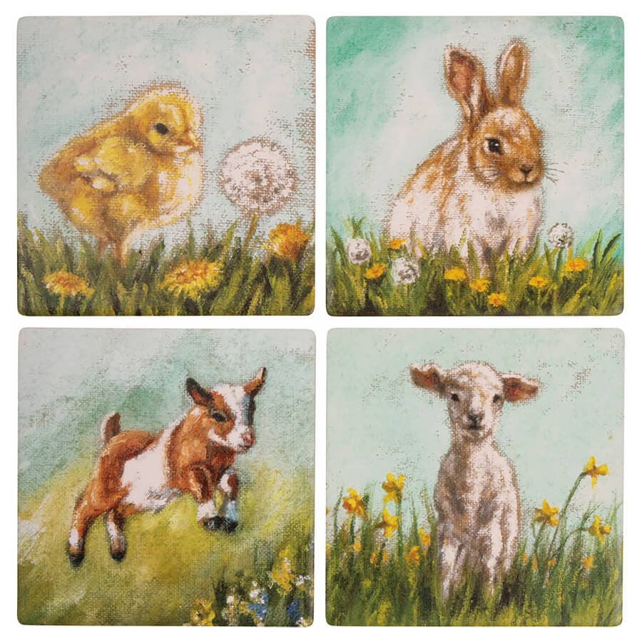 Ah, the idyllic farm life! If you're dreaming of open fields and pastoral visits, nothing will bring that charm quite like a Farm Animal Coaster. This rustic set of four coasters lends a cozy touch to your entertaining space but without sacrificing any style or panache and it comes in its own rack. Crafted from wood, this coaster set boasts a hearty, down-home quality sure to lend that extra something special as you enjoy coffee or liquid beverage with your guests. It also gets on board with the season - painted flowers decorate each piece in bright hues to herald springtime. Choose from a fluffy bunny, cute baby chick or choose between a pair sweet little lambs for your gatherings. As Mark Twain would say "A home is not a mere transient shelter: its essence lies in the personalities of the people who live there." Now you can show off your personality with these practical decorations!