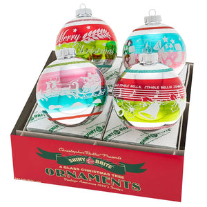 Even with a more traditional round shape, this Festive Fete Signature Flocked Round Ornaments Set still explodes with vibrant Festive Fete colors. Each one of these colorful ornaments has its own singular holiday design. One shows Santa flying his sleigh, another has jingling bells, another stockings and sweets but what would a tree be without a simple yet elegant “Merry Christmas”. ball hanging from its branches? A welcome addition to any Festive fete ornament collection! Christopher Radko is enamored with the Shiny Brite collection from the 1950's so these reproductions are inspired by the older styles in a new packaging with the same vintage feel.