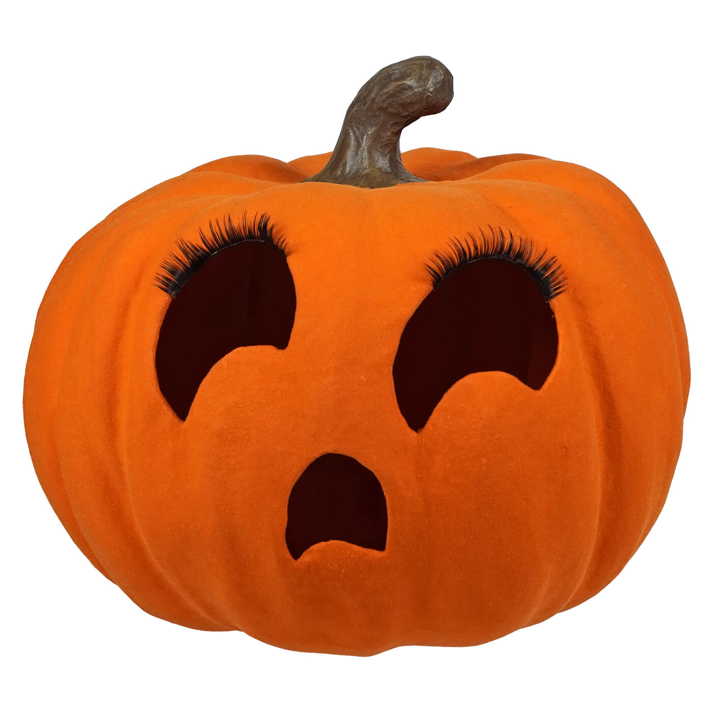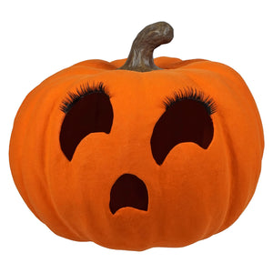 Big, expressive eyes and dramatic lashes give the Flocked Orange JOL a personality all its own. Measuring 12x12x10 inches, this pumpkin features a velvety flocked surface that adds texture to its deep orange body. A sculpted stem sits on top while the carved face creates a playful and slightly spooked expression.