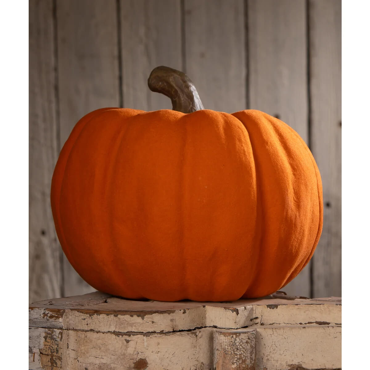 This pumpkin is designed to work in both daylight and nighttime displays. Placed on a mantel, tabletop, or entryway, its bold features and flocked texture make it an eye-catching piece. The combination of classic Halloween elements with unexpected details ensures it stands apart from standard seasonal decorations.