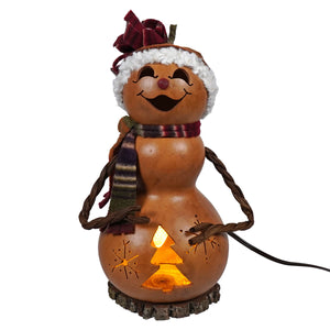 Flurry – Lighted Small Tall Brown Snowman Girl Gourd by Meadowbrooke Gourds is a festive little figure that proves even a snowman can rock holiday style. With her cheery Santa hat perched just so and a green-and-red plaid scarf snugly wrapped around her neck, she’s dressed for the season from head to toe. Her warm personality makes her the perfect guest to invite into your Christmas décor.
