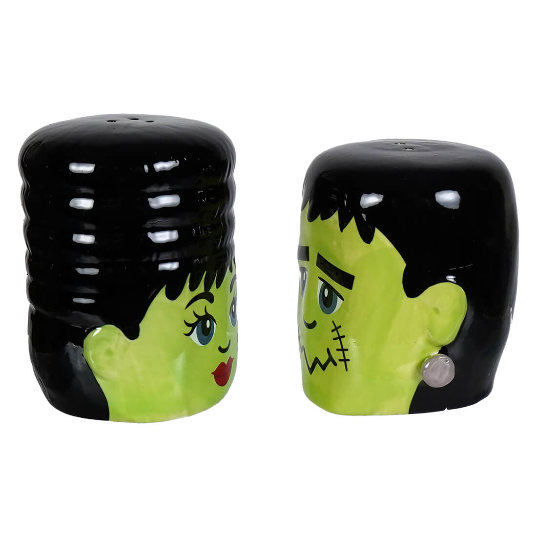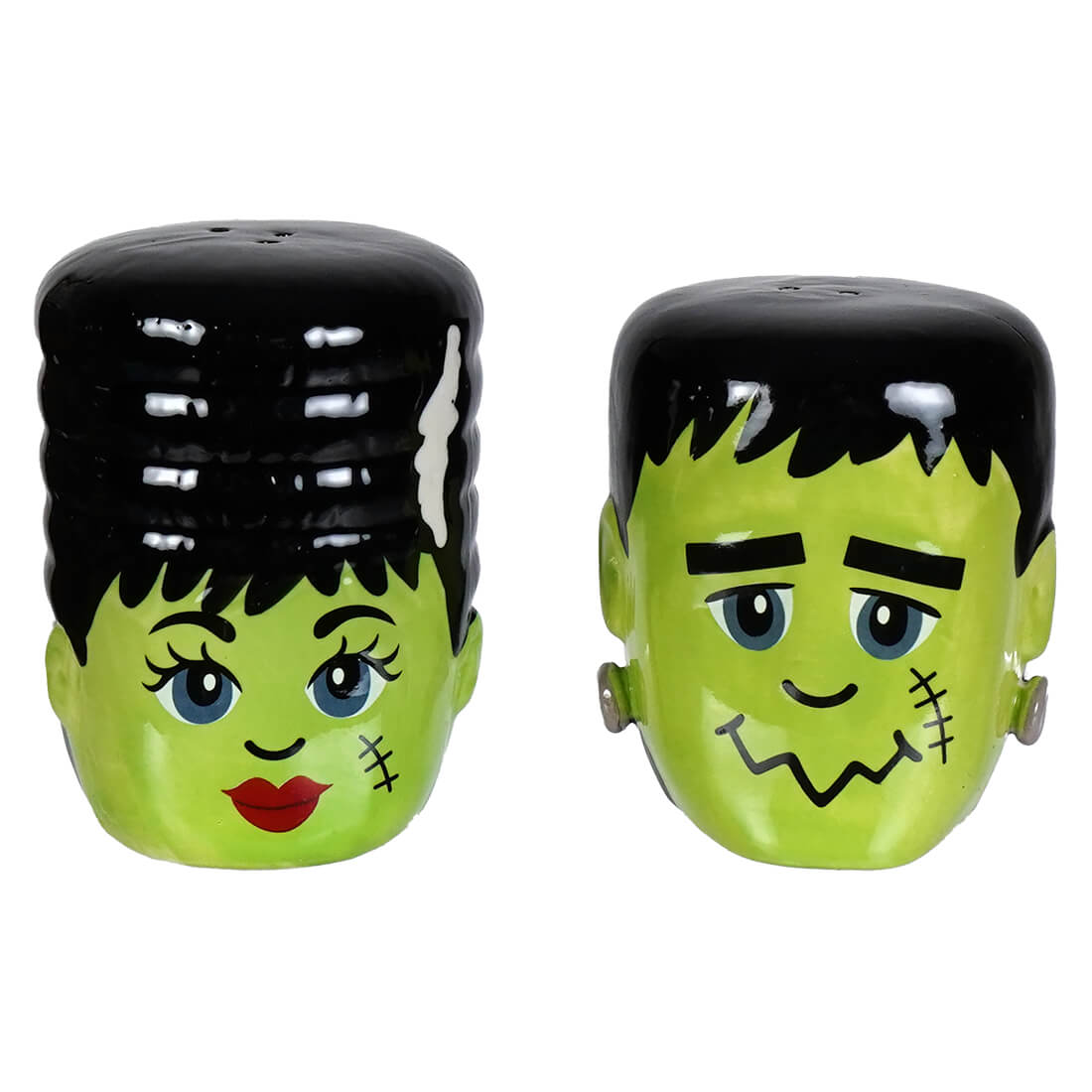 Both shakers are finished in a smooth, high-gloss glaze that adds a bit of shine to their bright green faces. Small holes on the tops of their heads make for easy seasoning, while flat bases keep them steady on the table, whether they’re spicing up a Halloween party or just adding a bit of monster fun to everyday meals.