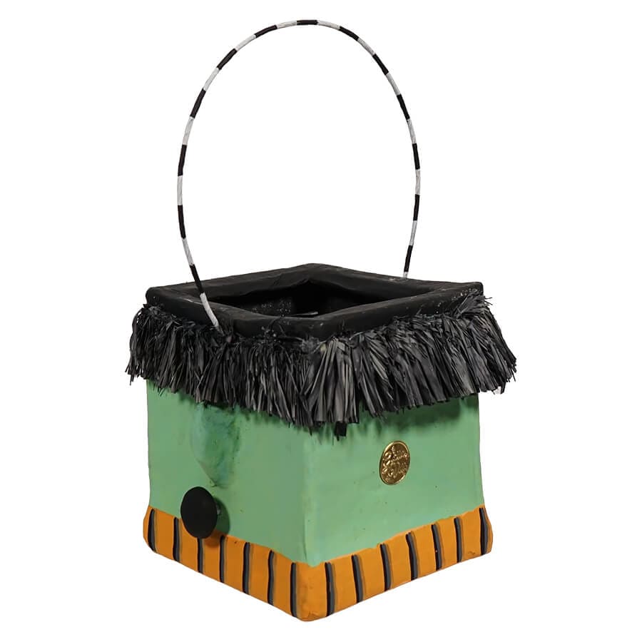 The Glitterville collection of buckets is a contemporary take on Halloween buckets. This square Frankenstein Face Halloween Mini Bucket, is unusual because it is square, but also because it is pretty literal! Frankenstein of course has the square forehead with black straight hair sticking out of it, but what would Frankenstein be without the bolts on the side of his neck! Such a great piece to add to your collection of Halloween buckets, but why not carry it as a purse to a party you are attending or fill it with treats and greet the trick or treaters, handing out candy from that awesome Frank bucket! They will know you mean Halloween business at your house!