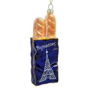 These two glass baguettes are peeking out like they just left the corner boulangerie, still warm and ready to elevate your evergreen with a touch of French flair. The sparkling blue sack gives off major “I casually picked these up on my morning stroll through Paris” energy—even if your actual stroll is just from the kitchen to the couch.