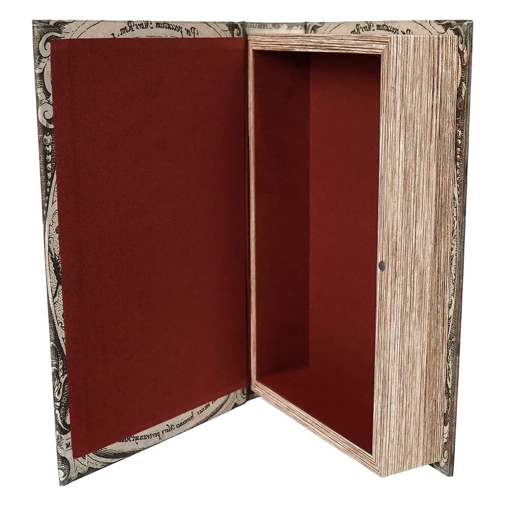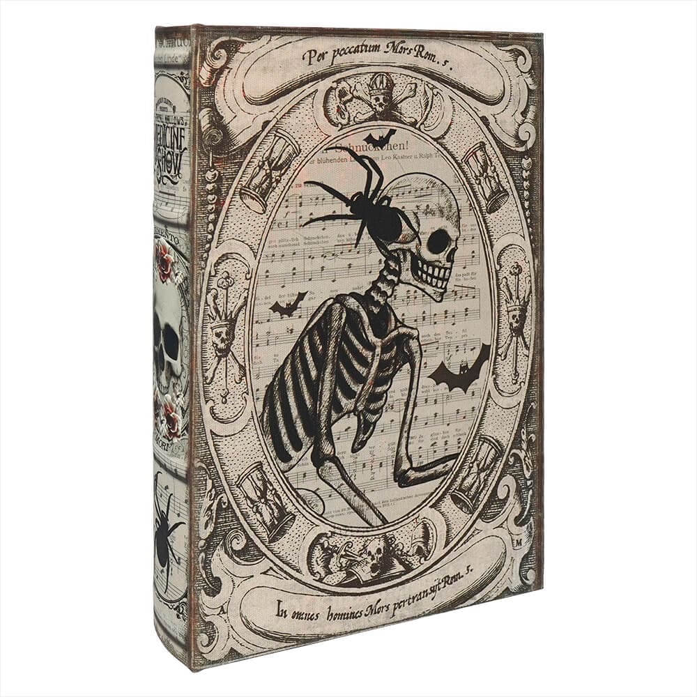 What a spooktacular deal! What we love about these three Fright Night Halloween book boxes is that they are multi-functional! Let's just start with the obvious, they are awesome to display in a gothic or black and white Halloween theme in your home. The vintage images on these books are pictured on newsprint or music sheets on all sides for a fun visual texture. The spine of the books either have the words "Medicine Show" or "October 31, 1873", and the empty cavity inside them are well hidden with what looks like aged pages of a book.