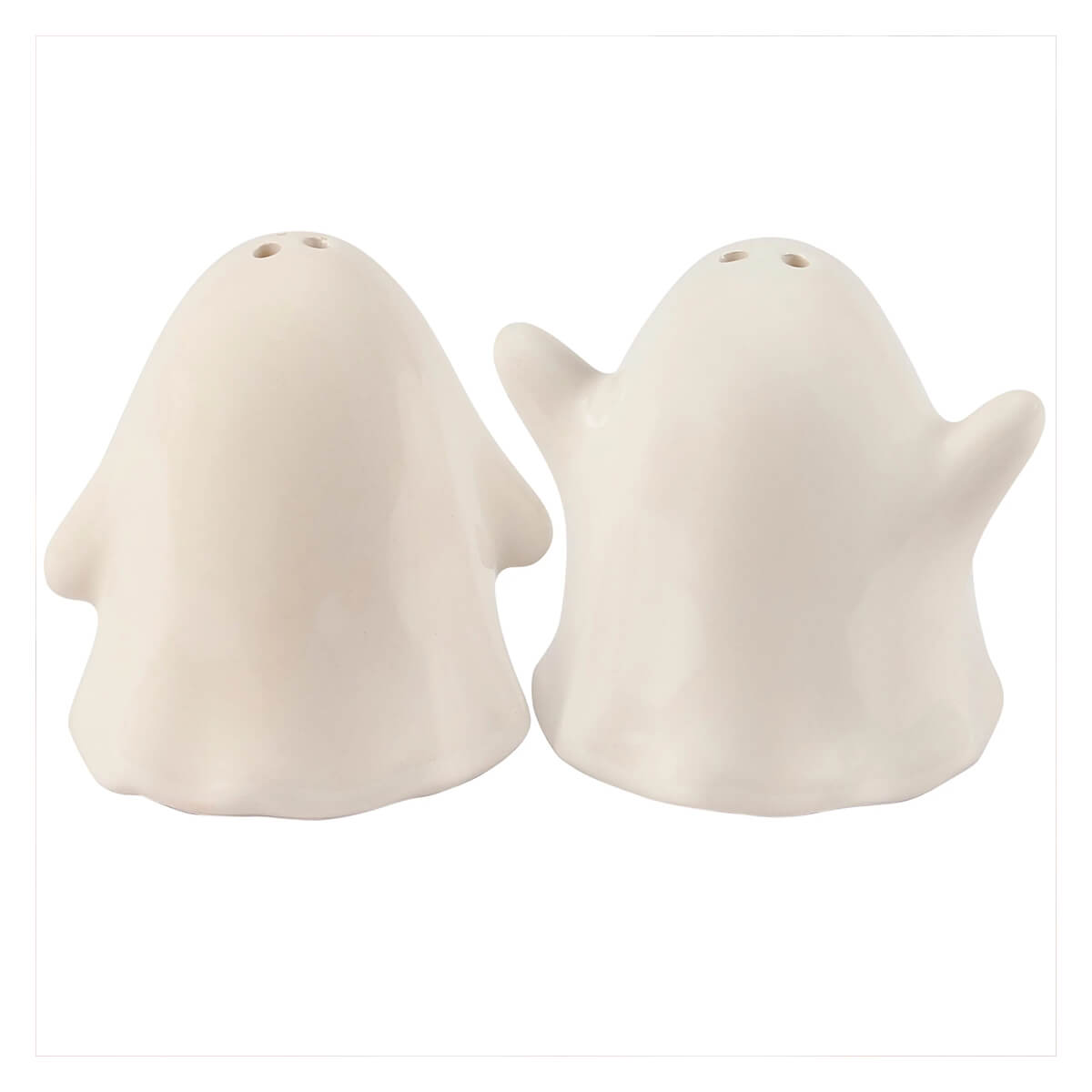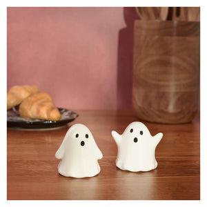 One ghost raises its arms in a lively “boo!” while the other keeps them down, creating a charming contrast that’s sure to make guests smile. Their expressive faces make seasoning the table unexpectedly entertaining.