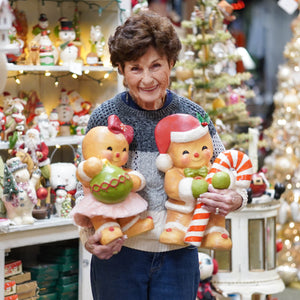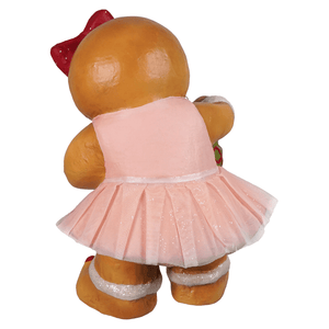 Gingerbread Joy by Bethany Lowe Designs is a delightful holiday figure that looks like she stepped straight out of a festive bakery display and into your seasonal décor. This charming gingerbread girl is dressed in a soft pink dress that adds a playful twist to classic gingerbread styling, topped off with a bright red bow that gives her just the right pop of color. Cradled in her hands is a shiny green ball ornament, making it clear she’s ready to help with the most important task of the season—decorating.